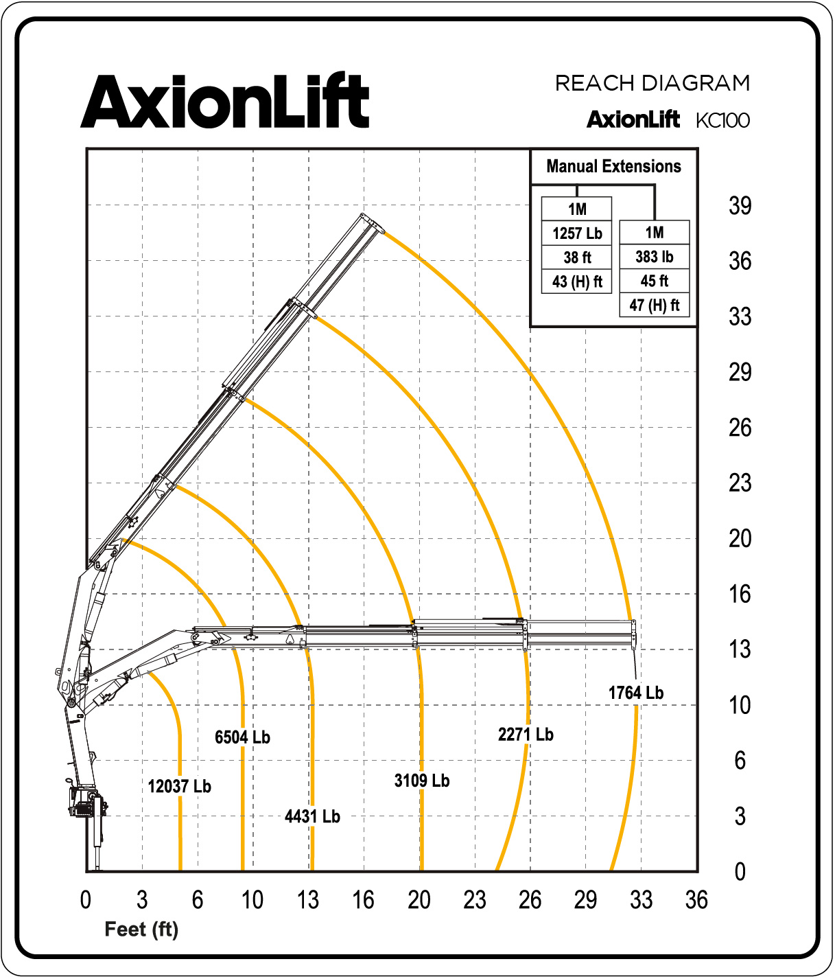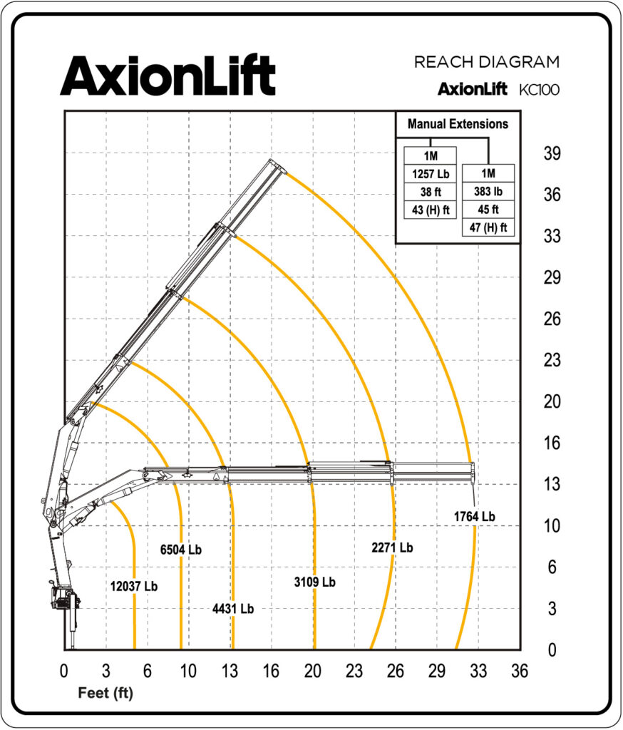 With a capacity of 68,930 lb ft and a reach of up to 38 ft, the KC100 stands out for its power and flexibility. Designed for demanding jobs, it supports up to three hydraulic and two manual extensions, offering compatibility with multiple accessories to adapt to diverse applications.